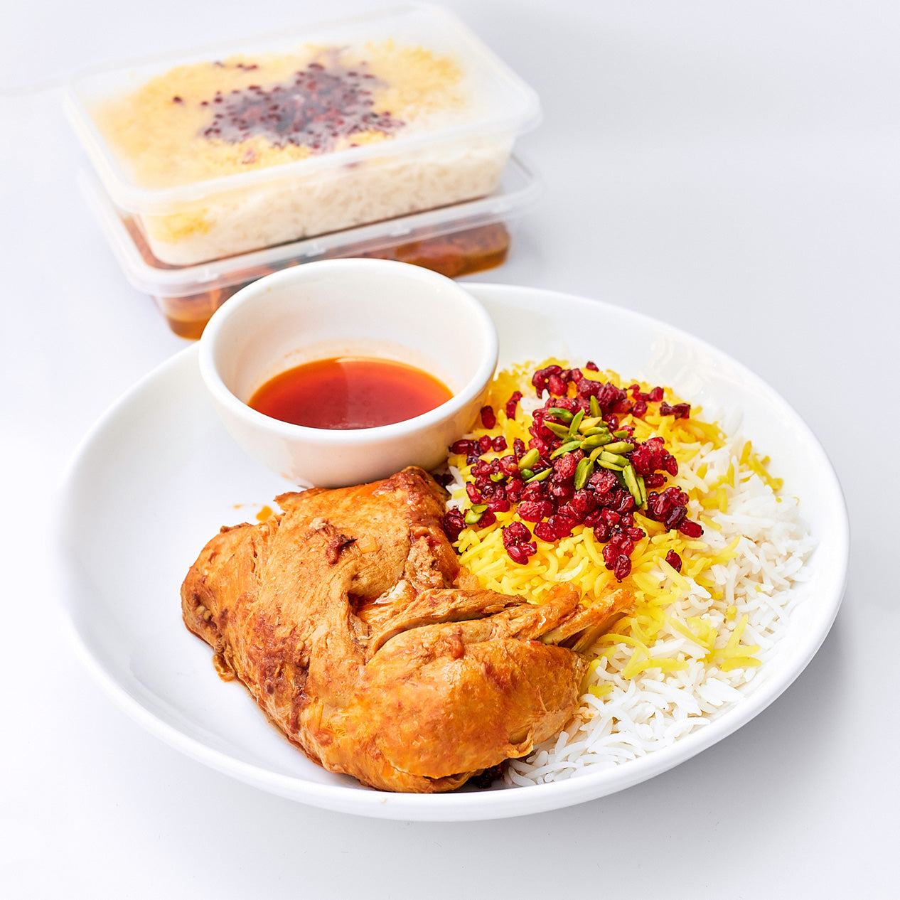 Indulge in the rich flavours of Persian cuisine with our tantalising Barberry Rice with Chicken. This traditional dish features succulent pieces of tender chicken marinated in a blend of aromatic spices, served with rice infused with fragrant saffron garnished with vibrant barberries, known for their unique sweet-tart flavour profile. Completed with zesty orange peel, and diced pistachios.