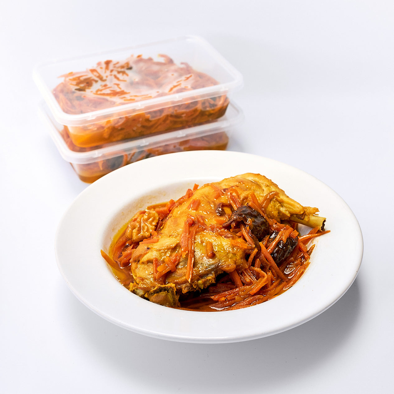Slow cooked chicken with tender carrots, prunes and walnuts, slow-cooked in a flavourful blend of cinnamon, cardamom, and caramelised onions.